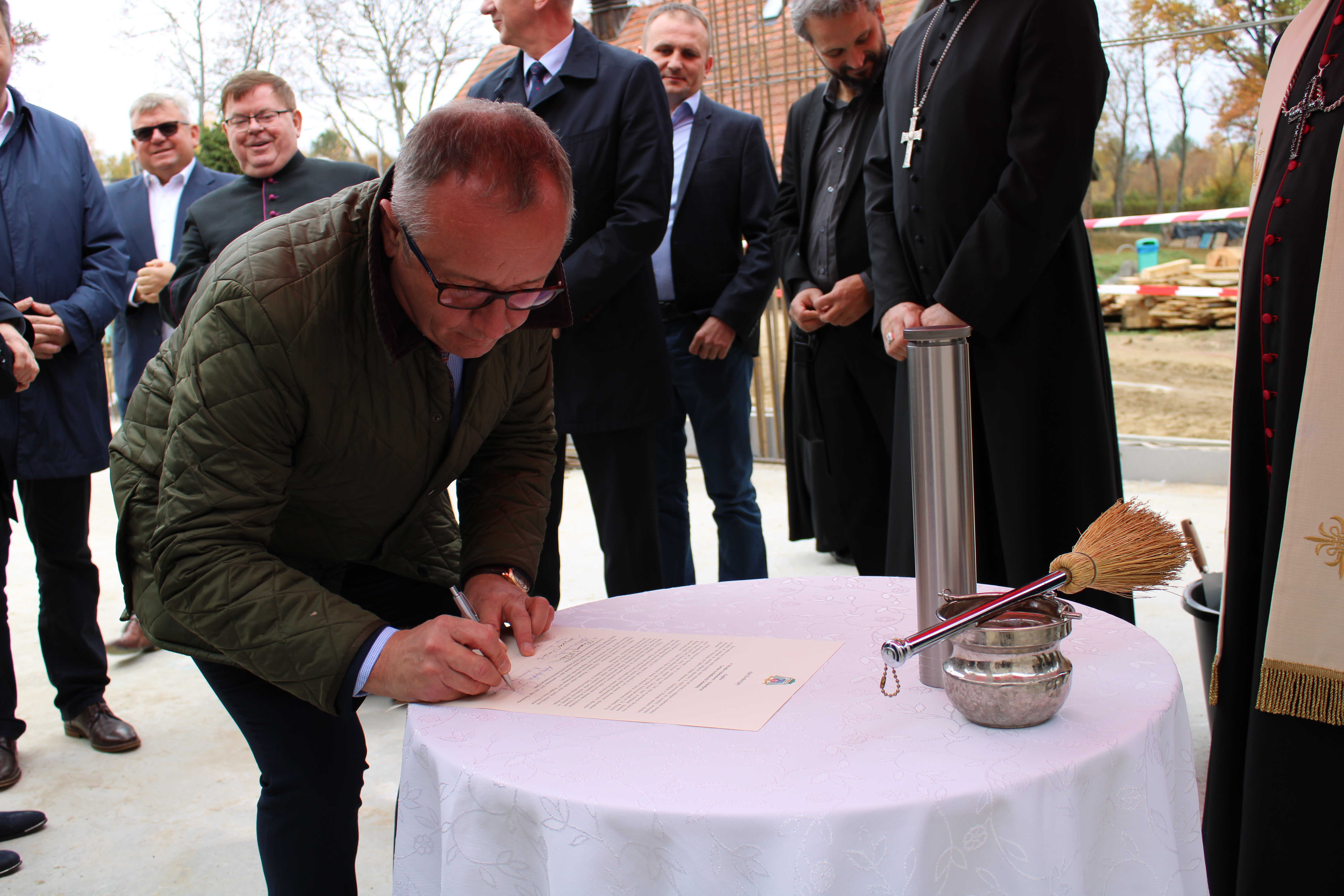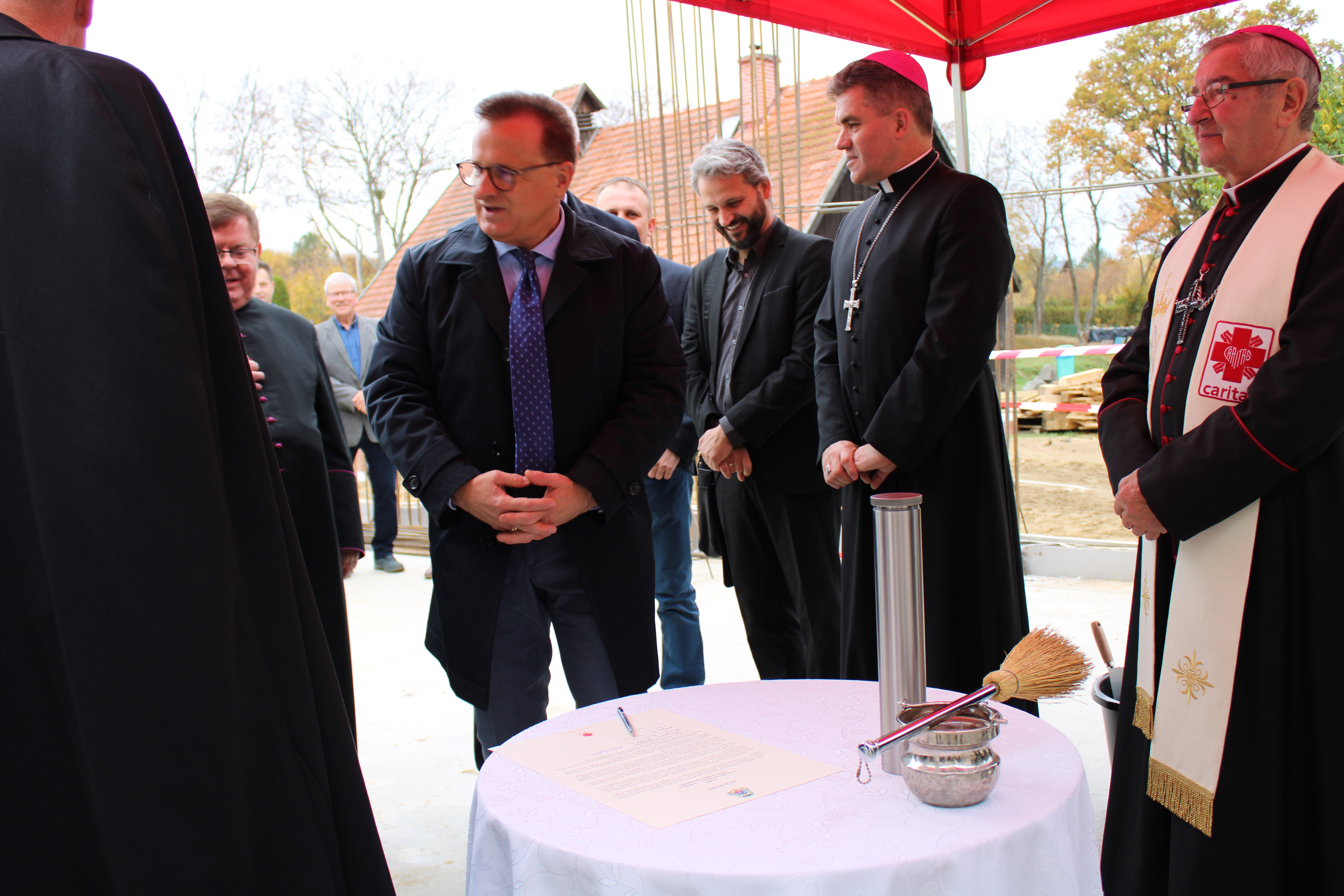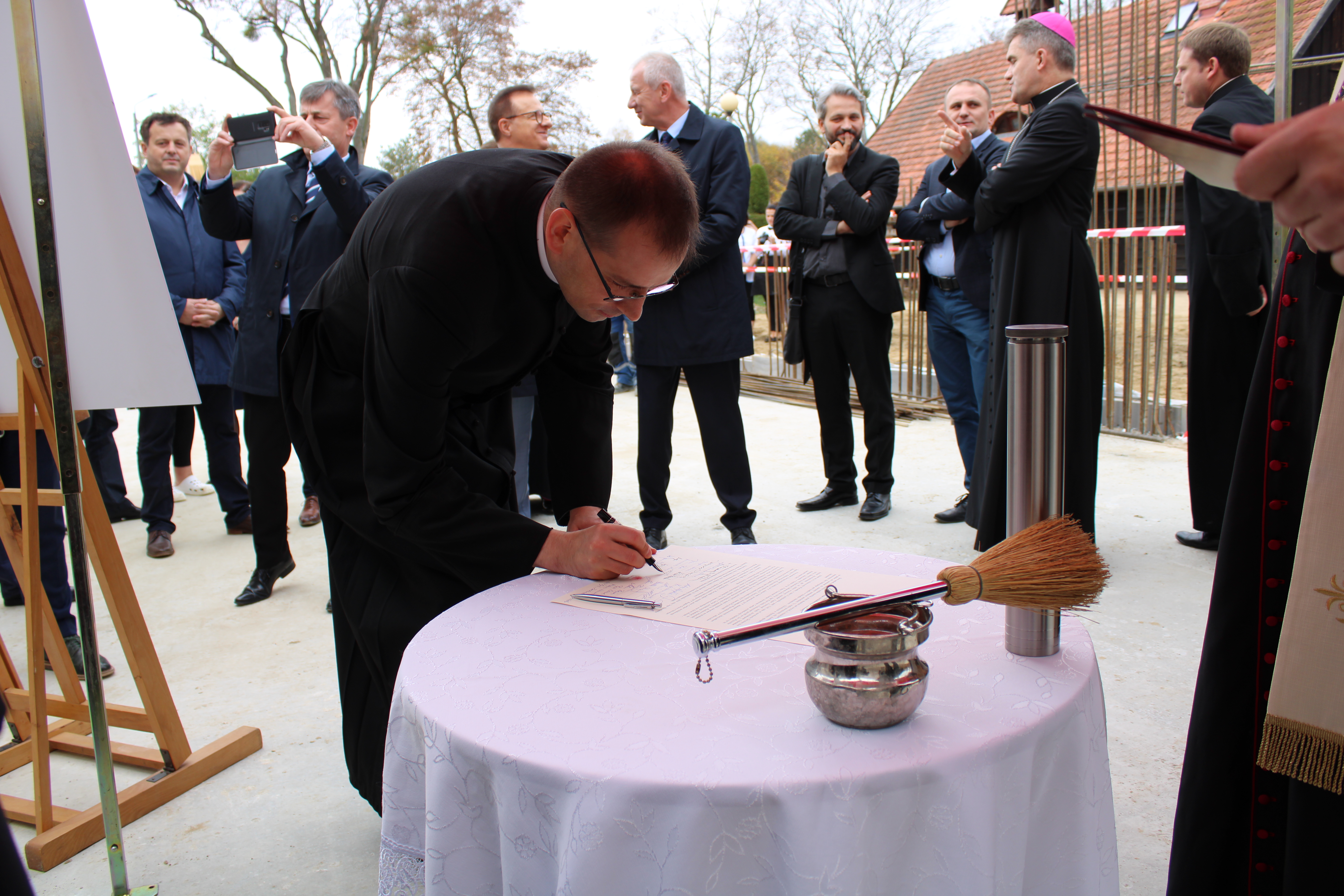 W dniu 23 października 2019 r. o godz. 12:00 w Ośrodku Warzenko znajdującym się przy ul. Kasztanowej 48 odbyła się uroczystość wmurowania kamienia węgielnego pod budowę Kaplicy. Kamień węgielny oraz powstające mury Kaplicy poświęcili JE Ks. Bp. Sławoj Leszek Głódź, Ks. Bp Wiesława Szlachetka oraz Ks. Bp. Zbigniew Zieliński. W uroczystości brało udział wielu znamienitych gości, w szczególności Starosta Kartuski P. Bogdan Łapa, Wicestarosta Kartuski P. Piotr Fikus, Wójt Gminy Przodkowo P. Andrzej Wyrzykowski, Prezes WFOŚiGW w Gdańsku P. Maciej Kazienko, Proboszcz Parafii w Kielnie Ks. Franciszek Rompa, projektant budynku Kaplicy P. Piotr Orlicki, inspektor nadzoru P. Bogdan Gruca, właściciel firmy OL-Trans, która buduje Kaplicę P. Olgierd Hewelt wraz z kierownikiem budowy i pracownikami oraz Sołtys wsi Warzenko P. Tadeusz Skrzyński. Gospodarzami tego niecodziennego i niezwykle ważnego wydarzenia dla Caritas Archidiecezji Gdańskiej byli: Dyrektor Caritas Archidiecezji Gdańskiej Ks. Janusz Steć, wicedyrektor Ks. Piotr Brzozowski, wicedyrektor Ks. Tomasz Kosewski oraz Sylwia Motyka – Kierowniczka Ośrodka w Warzenku.