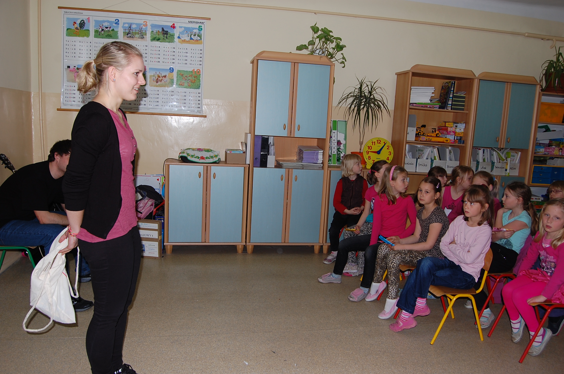 Na zakończenie cyklu spotkań wolontariuszy zagranicznych z dziećmi ze świetlic żukowskich wybraliśmy się w odwiedziny do Szkoły Podstawowej w Tuchomiu. Nasza wizyta wywołała wśród dzieci duże zainteresowanie. Na spotkanie przyszli wszyscy uczniowie, czyli ok. 30 osób. Kati i Sasza, którzy są w Polsce już od sierpnia bardzo dobrze mówią po polsku, więc dzieci rozumiały ich bez problemu. Zadawały mnóstwo pytań i chętnie brały udział w konkursach. Nawet nie wiemy kiedy minęły nam dwie godziny. Najwięcej radości sprawiły dzieciom słodki quiz przygotowany przez Kati i mini koncert Saszy.