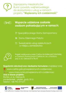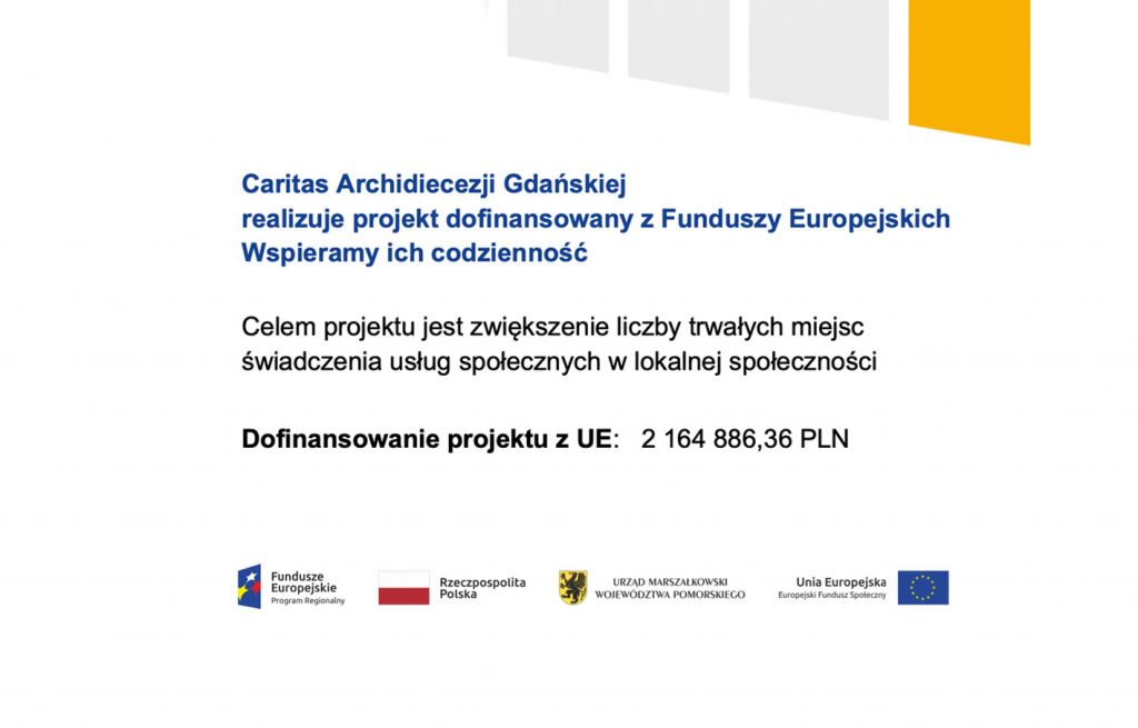 Caritas Archidiecezji Gdańskiej oraz – jako partner – Miejski Ośrodek Pomocy Społecznej w Rumi uczestniczą w realizacji projektu pt. „Wspieramy ich codzienność”, który jest realizowany w ramach Regionalnego Programu Operacyjnego Województwa Pomorskiego na lata 2014-2020 współfinansowanego z Europejskiego Funduszu Społecznego oraz ze środków budżetu państwa.