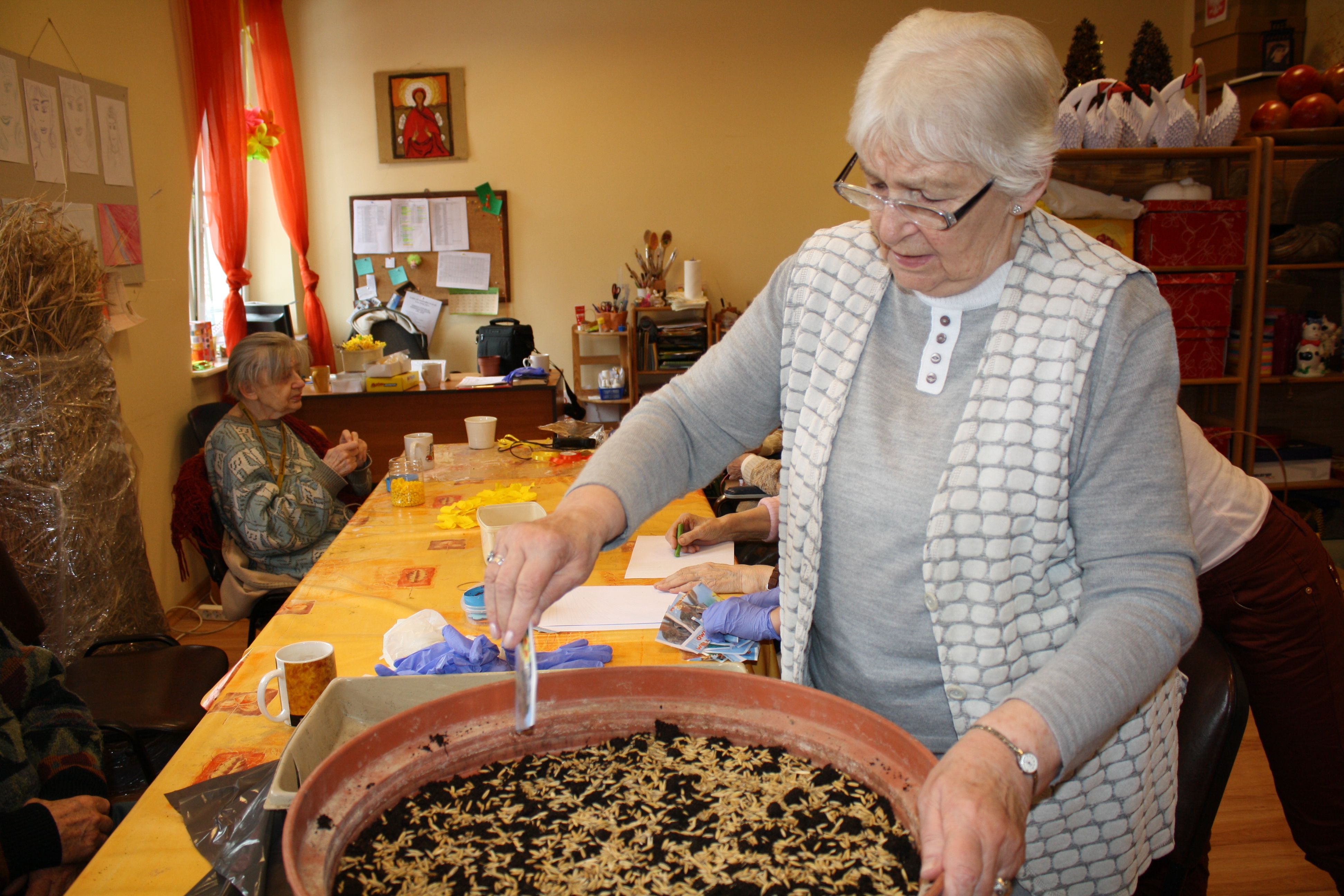Tradycją naszego Domu jest to, iż przed Świętami wielkanocnymi spotykamy się na wspólnym wysiewie owsa. Tego roku dzień ten przypadł na piątek 15 marca. Spotkaliśmy się wszyscy w godzinach przedpołudniowych w pracowni terapii zajęciowej, gdzie czekały na nas przygotowane przez terapeutki doniczki, ziemia, owies, fartuszki oraz rękawiczki. Zwarta i gotowa do pracy grupa mieszkańców ochoczo zabrała się do wysiewu. Swoją pomocą służyła nam również nasza sympatyczna wolontariuszka Ania oraz praktykantka Michalina. Czas upłynął nam w bardzo miłej atmosferze. Każdemu zostały przydzielone inne zadania. Jedni przygotowali doniczki z ziemią, inni siali owies, pozostali przysypywali ziemią i podlewali wysiane nasionka. Tak przygotowane doniczki z owsem przewieźliśmy do słonecznej Kawiarenki, gdzie mamy nadzieję wyrośnie nam przepiękna trawka, która zostanie wykorzystana do dekoracji Domu oraz stołu wielkanocnego.