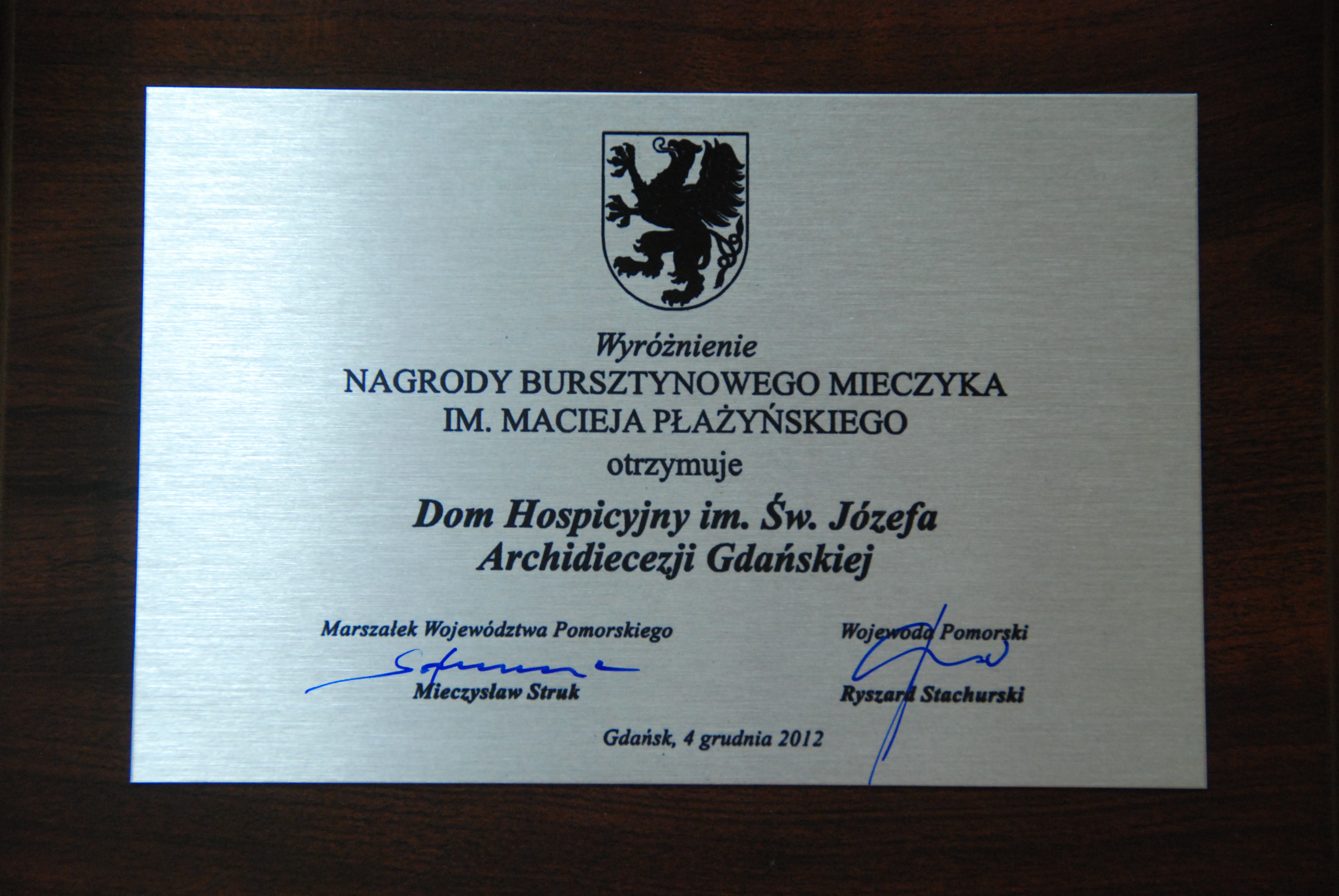 Podczas 18 Gali Nagrody Bursztynowego Mieczyka, która odbyła się 4 grudnia w Polskiej Filharmonii Bałtyckiej im. Fryderyka Chopina w Gdańsku, Kapituła Nagrody przyznała wyróżnienie „Bursztynowego Mieczyka” dla Domu Hospicyjnego św. Józefa Caritas Archidiecezji Gdańskiej.