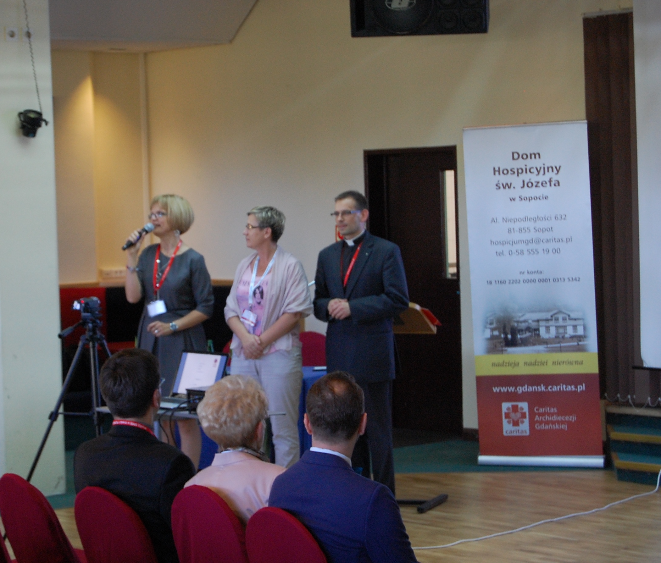 Konferencję otworzyli gospodarze konferencji – ks. Tomasz Kosewski i dr Aleksandra Modlińska, a ks. Janusz Steć Dyrektor CARITAS Archidiecezji Gdańskiej powitał wszystkich zgromadzonych. W pierwszych chwilach głos także zabrała prof. Krystyna De Walden Gałuszko opowiadając o powstaniu sopockiego hospicjum, jego atmosferze i personelu. Następnie – na ręce Dyrektora – złożony został kwiat wykonany przez pacjentkę jednego z hospicjów.
