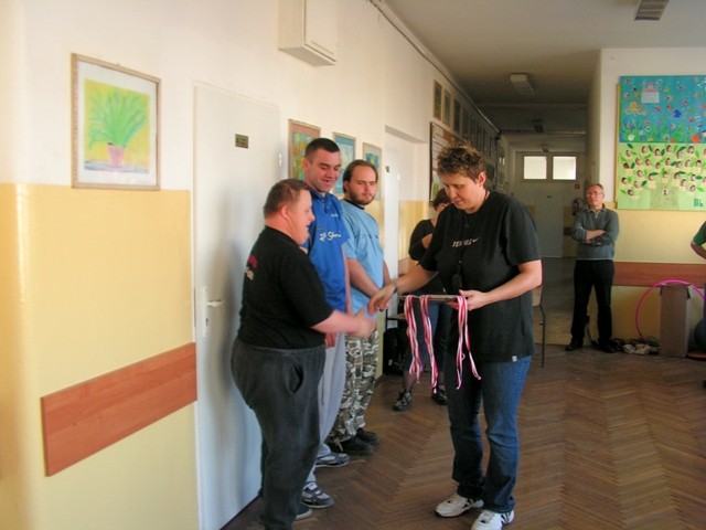 21 listopada 2009 roku silna grupa siedmiu reprezentantów Warsztatu Terapii Zajęciowej w Krzywym Kole wzięła udział w XII Powiatowej 0limpiadzie Sportowej dla Osób Niepełnosprawnych w Pruszczu Gd. Zawodnicy walczyli z pełnym zaangażowaniem w przeróżnych konkurencjach – zadziwiony instruktor dowiedział się między innymi, ze chłopcy potrafią grać w hokeja, piłkę koszykową, rzucać do celu, biegać w slalomie… wszystkiego nie sposób spamiętać. Po wyczerpującej rywalizacji przyszedł czas na posilny obiad, a potem nadeszła wyczekiwana przez wszystkich chwila – rozdanie nagród…..Zdobyliśmy już tradycyjnie pokaźną ilość różnokolorowych medali, wśród których, ku naszej dumie, przeważały złote!!! Oprócz medali otrzymaliśmy też wspaniałe nagrody – plecaki, które chłopcy przyjęli z wielką radością, gdyż – jak stwierdzili – teraz będą mogli porządnie spakować się na ryby . Pojechaliśmy do domu rozgadanym i roześmianym busem. Tak, zdecydowanie, w sporcie jesteśmy naprawdę dobrzy!
