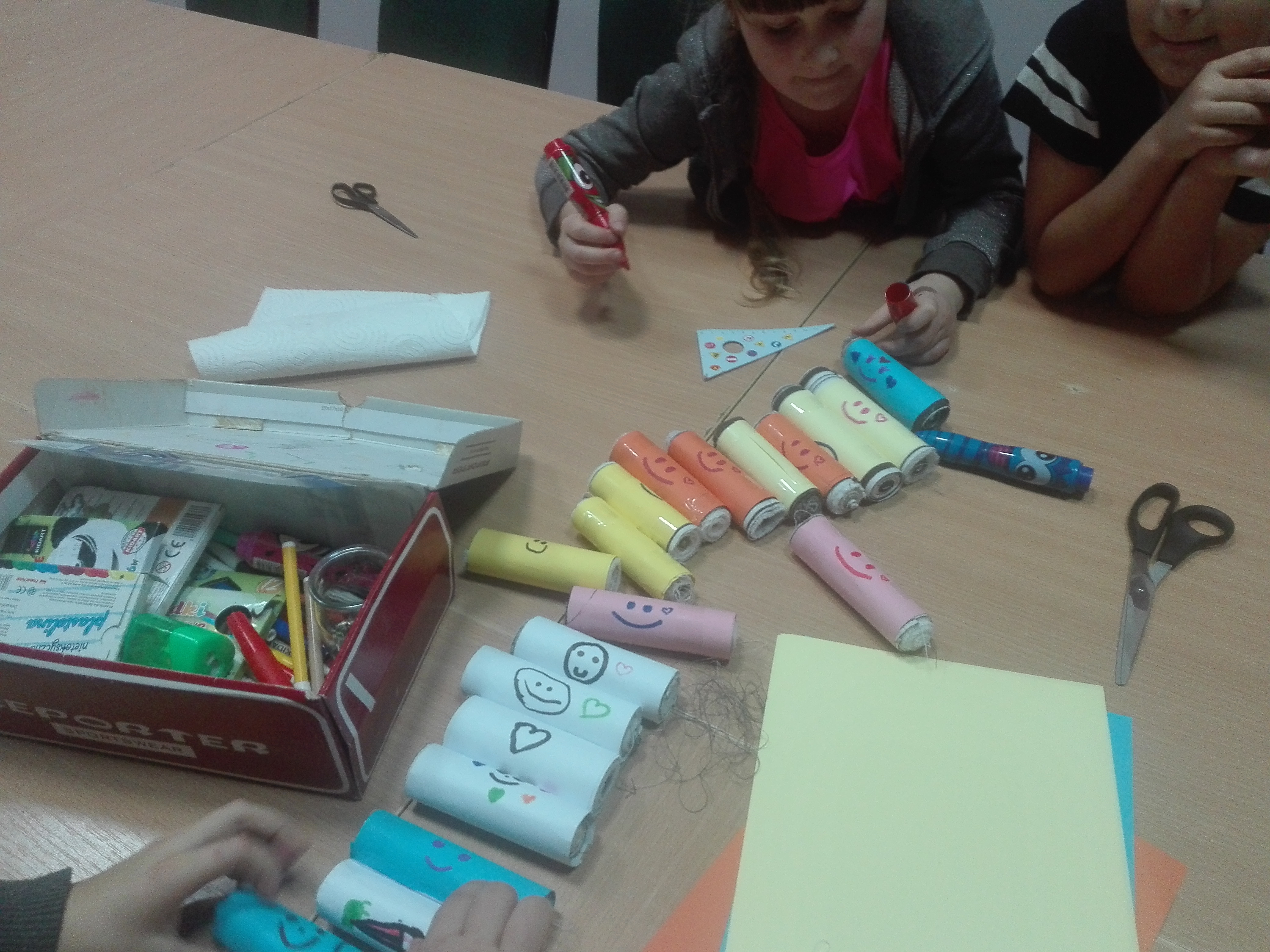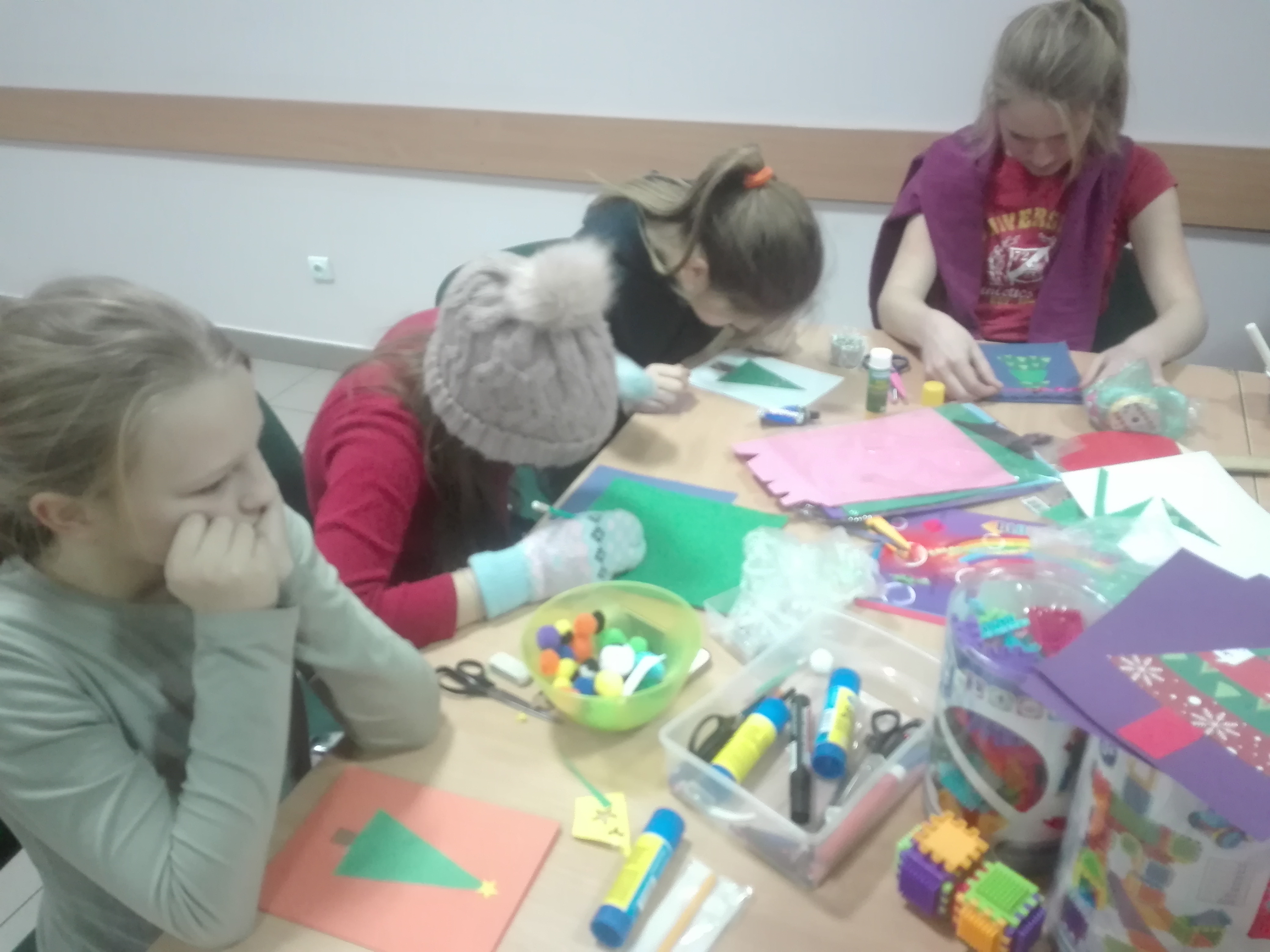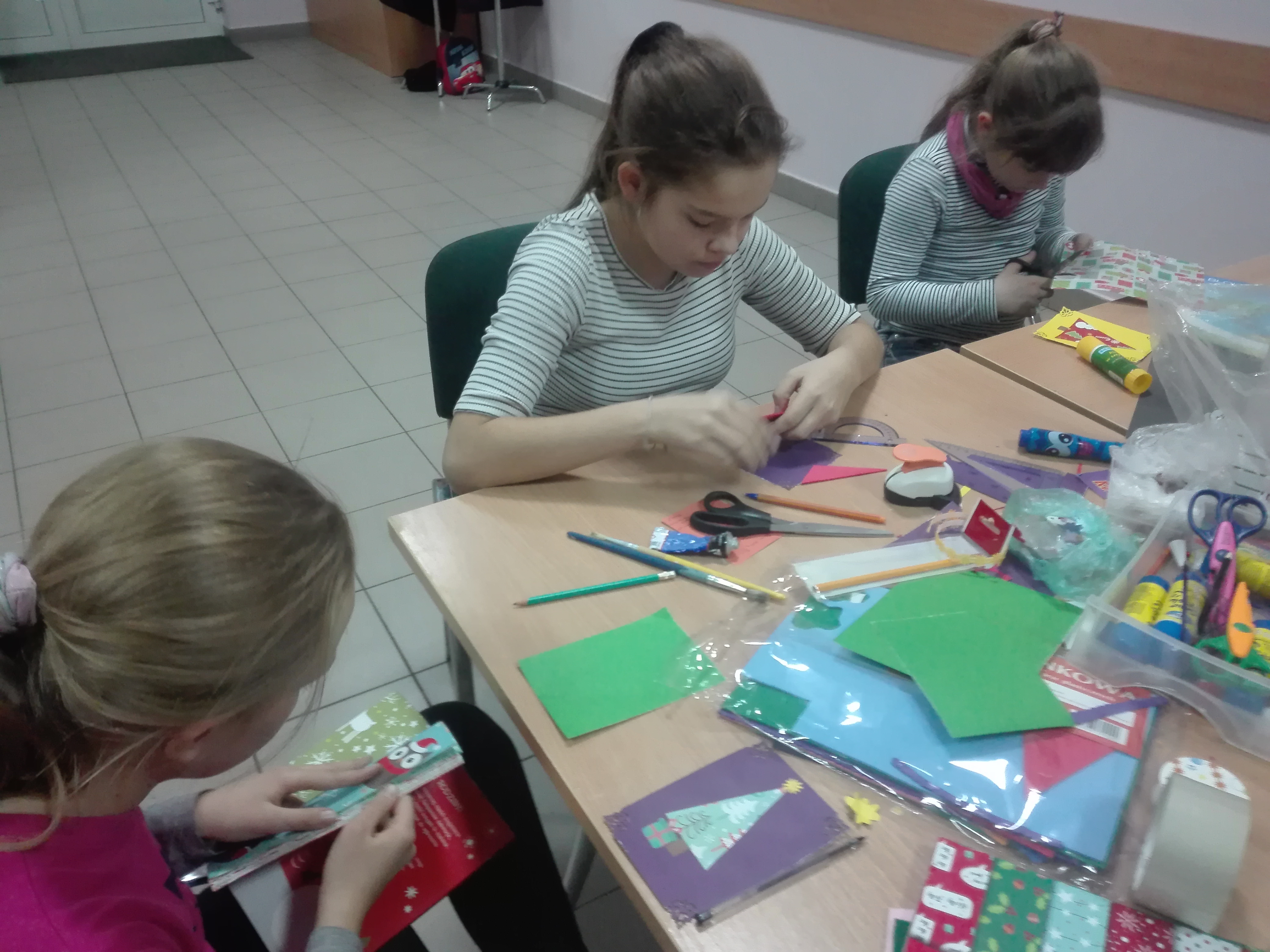 Dzieci ze świetlicy w Łapinie włączyły się ostatnio w akcję robienia bandaży dla szpitala w Kasisi w Zambii w Afryce. Napisały też list z pozdrowieniami, który dołączymy do paczki. Z myślą o zbliżających się świętach uczestnicy zaangażowali się również w przygotowanie różnych kolorowych kartek świątecznych dla dzieci z hospicjum w Lublinie oraz dla mieszkańców Domu Seniora w Przyjaźni.