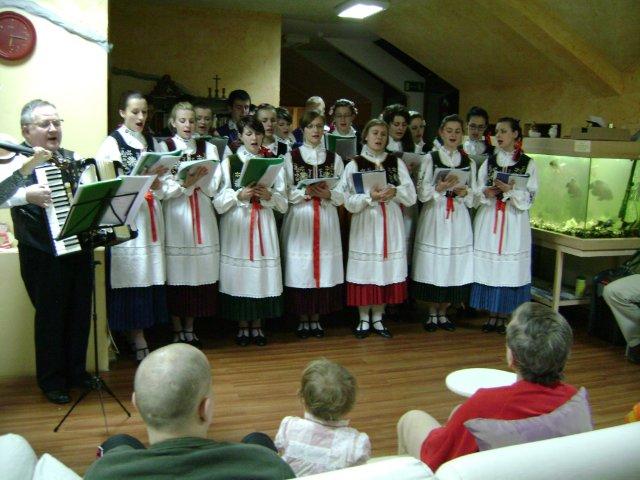 Wczoraj po raz kolejny zagościli w Domu Hospicyjnym im. św. Józefa nasi przyjaciele z Zespołu Tańca Ludowego „Neptun” AWFiS Gdańsk. Po raz kolejny, ponieważ dzień przed świętem niepodległości zaśpiewali nam utwory patriotyczne, które widzowie bardzo miło wspominają. Zespół Neptun to studenci Akademii Wychowania Fizycznego i Sportu im. Jędrzeja Śniadeckiego oraz muzycy. Swoją działalność artystyczną prowadzą od 1984 roku. Grupa wokalno-taneczna prezentuje przede wszystkim tańce kaszubskie, ale w ich repertuarze można znaleźć także tańce narodowe, tańce krakowiaków wschodnich, jak i pieśni i przyśpiewki. Tym razem zaśpiewali i zagrali kolędy. Podczas ich koncertu można było odczuć w naszym domu świąteczną atmosferę. Swoim talentem i uśmiechem sprawili ogromną radość każdemu z widzów. Wykonali dla nas znane kolędy, m.in. ,,Bóg się rodzi” , ,,Dzisiaj w Betlejem” oraz pastorałki ,,Pada śnieg” czy ,,We wish you a merry christmas”. Można było odczuć głębokie wzruszenie, widząc naszych podopiecznych uśmiechniętych i śpiewających razem z zespołem. Jesteśmy ogromnie wdzięczni całemu zespołowi oraz wszystkim, którzy przyczynili się do zrealizowania tego koncertu. Mamy nadzieję, że już niebawem odwiedzą nas ponownie i zaprezentują nam niektóre tańce ludowe.