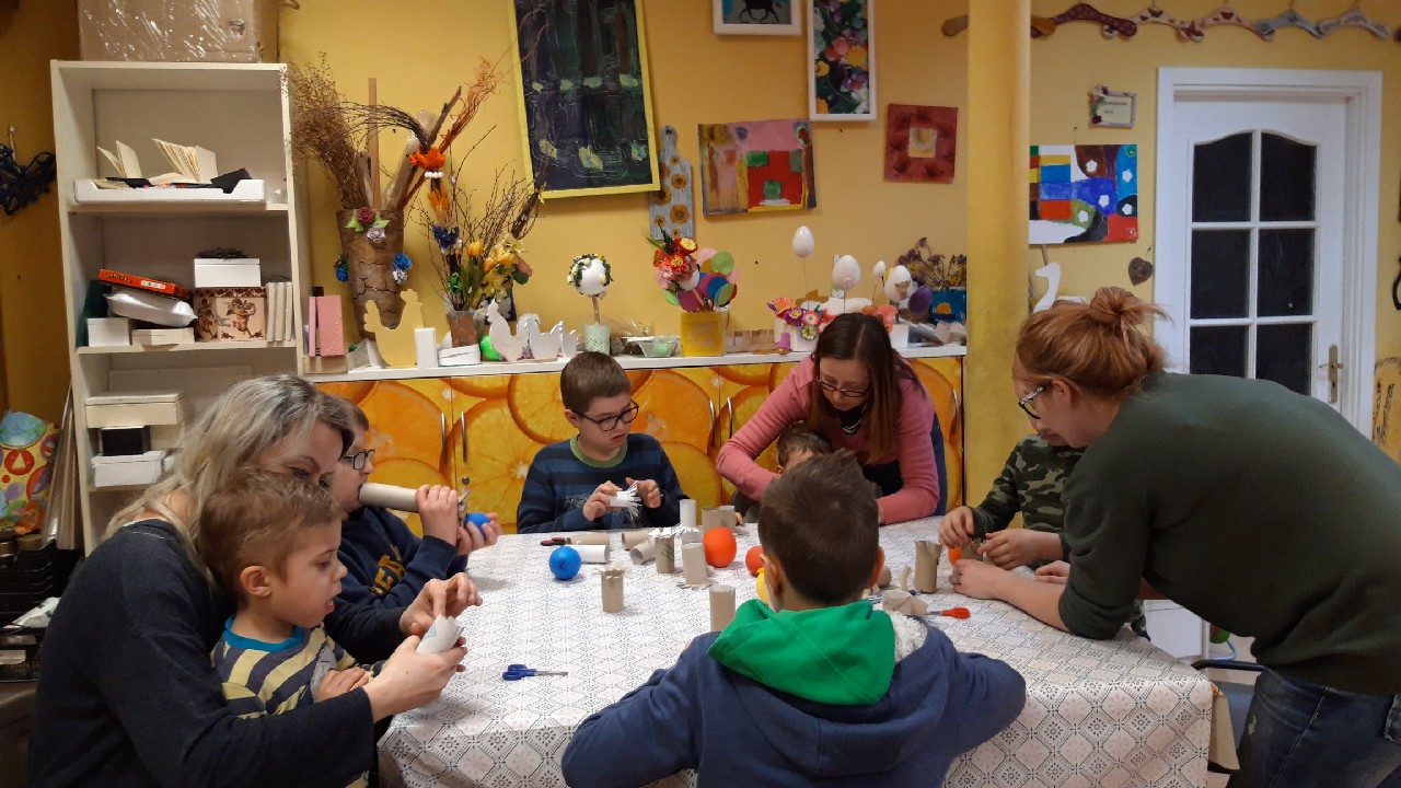 Po roku intensywnej pracy dobiega koniec realizacji projektu Kierunek –Samodzielność . Terapeuci w  w placówce w Łapinie nie odłożyli jeszcze pracy do szuflad i pełną parą prowadzą ciekawe i różnorodne zajęcia dla beneficjentów projektu. Zajęcia plastyczne prowadzone w grupie kształtują umiejętności współpracy, rozwijają u dzieci zdolności twórczego myślenia, doskonalą umiejętności posługiwania się różnymi narzędziami i materiałami plastycznymi. Po każdych zajęciach dzieci odpoczywają przy pysznym poczęstunku.