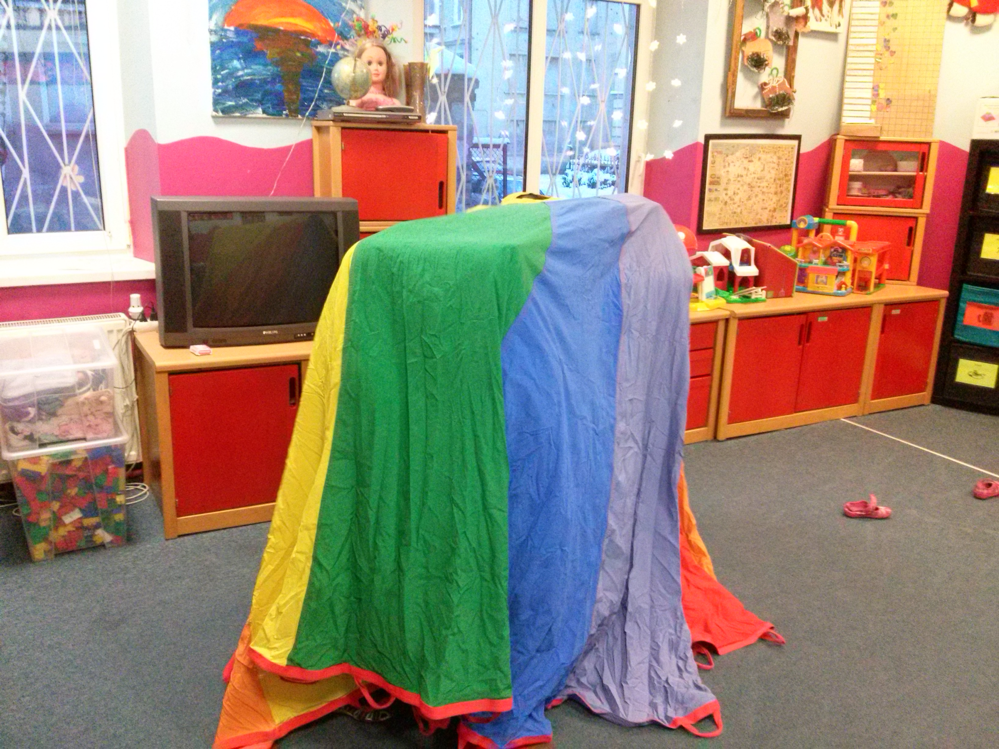 Wychowankowie „Anielskiej Krainy” bardzo lubią zabawy z chustą animacyjną. Wczoraj, między innymi, bawili się w „cukierka” i w posągi. Tym razem możemy się przyjżeć jak powstał kolorowy słoń.
