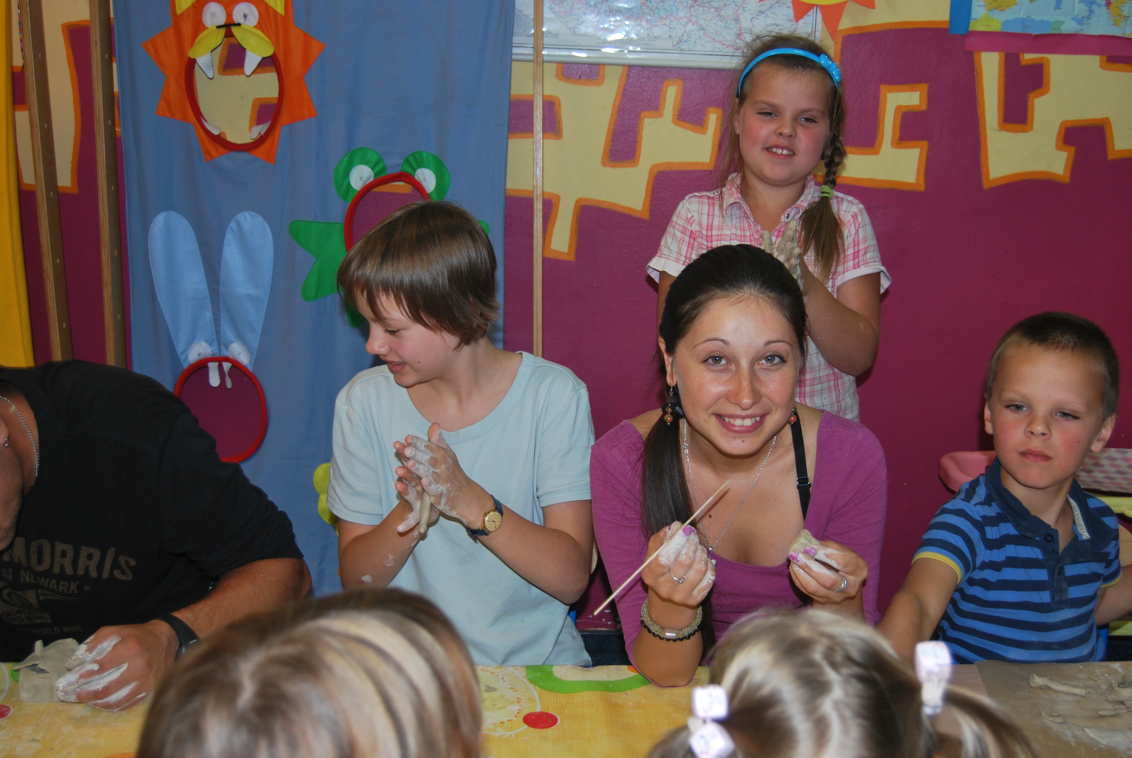 30 sierpnia w naszej świetlicy odbyły się zajęcia ceramiczne. Pomysłodawczynią tych zajęć była nasza wolontariuszka Aurica. Po tygodniowej nieobecności w świetlicy, dzieci strasznie za Nią tęskniły i wielka była ich radość na informację, że tym razem spróbują swoich sił na zajęciach ceramicznych. Na początku należało przygotować salę, by zabezpieczyć ją przed nadmiernym zabrudzeniem, więc dzieci wspólnymi siłami przestawiły stoły i nakryły je ochronnymi materiałami. Potem już tylko zabawa 🙂 Każdy otrzymał mały bloczek gliny i dał upust swojej wyobrażni i niesamowitym pomysłom. Po wypieczeniu gliny, powstały takie arcydzieła jak : korale, kostki do gry, wiejska chatka, misie, plastusie, piłeczki i inne wytwory, które niełatwo było nazwać. Ważne, że wszyscy świetnie się bawili i chętnie ze sobą współpracowali, a po ciężkiej i twórczej pracy, przywróciły salę bawialną do wcześniejszej postaci 🙂