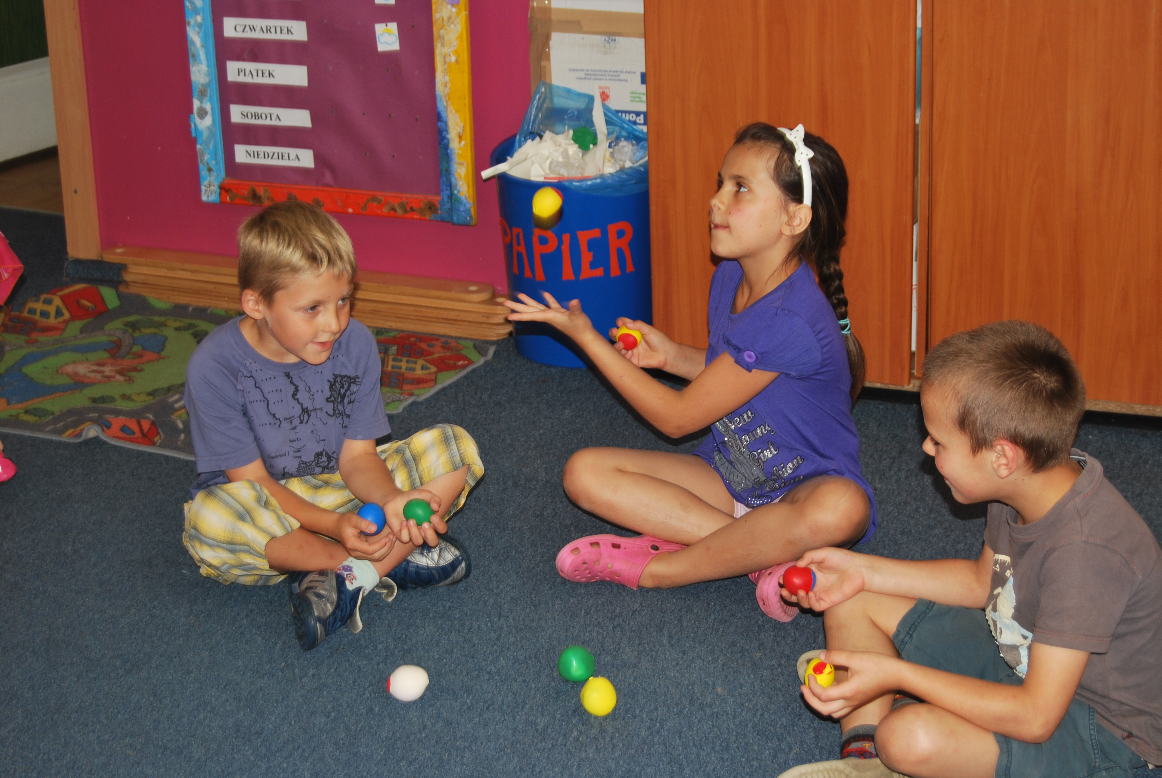 I nadszedł dzień kolejnych zajęć z naszą wolontariuszką Isabel. Tym razem były to zajęcia cyrkowe. Dzieci z niecierpliwieniem czekały na wyjaśnienie co będzie tematem zajęć, gdy Isabel rozkładała na stołach: folie, kolorowe balony i piasek. W końcu dzieci dowiedziały się, że samodzielnie wykonają piłeczki do żonglerki. Z wielką radością dzieci napełniały folię spożywczą piaskiem, następnie na tak przygotowane piłeczki, nakładały balony o wybranych przez siebie kolorach. Aale prawdziwa zabawa rozpoczęła się, gdy wszystkie piłeczki były już gotowe. Nastąpił pokaz umiejętności żonglerskich naszych podopiecznych. Część dzieci próbowała swoich sił z dwiema kuleczkami, a inni ryzykowali, aż z trzena elementami. Isabel dostarczyła nam wiele radości i zabawy…ciekawe co wymysli następnym razem 🙂