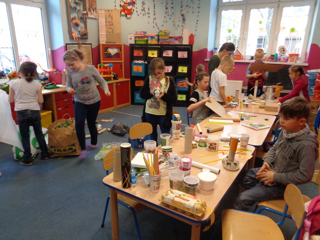 Grupa „Anielska Kraina” w związku z obchodzonym w zeszłym tygodniu Dniu Ziemi, pogłębiała swoją wiedzę z zakresu ekologii podejmując się rozwiązywania quizowych zagadek. Nastepnie dzieci wykorzystując różne odpady rozpoczęły prace nad „EKO-Pucharami”. Powstały bardzo ciekawe projekty, które jeszcze czekają na wykończenie.