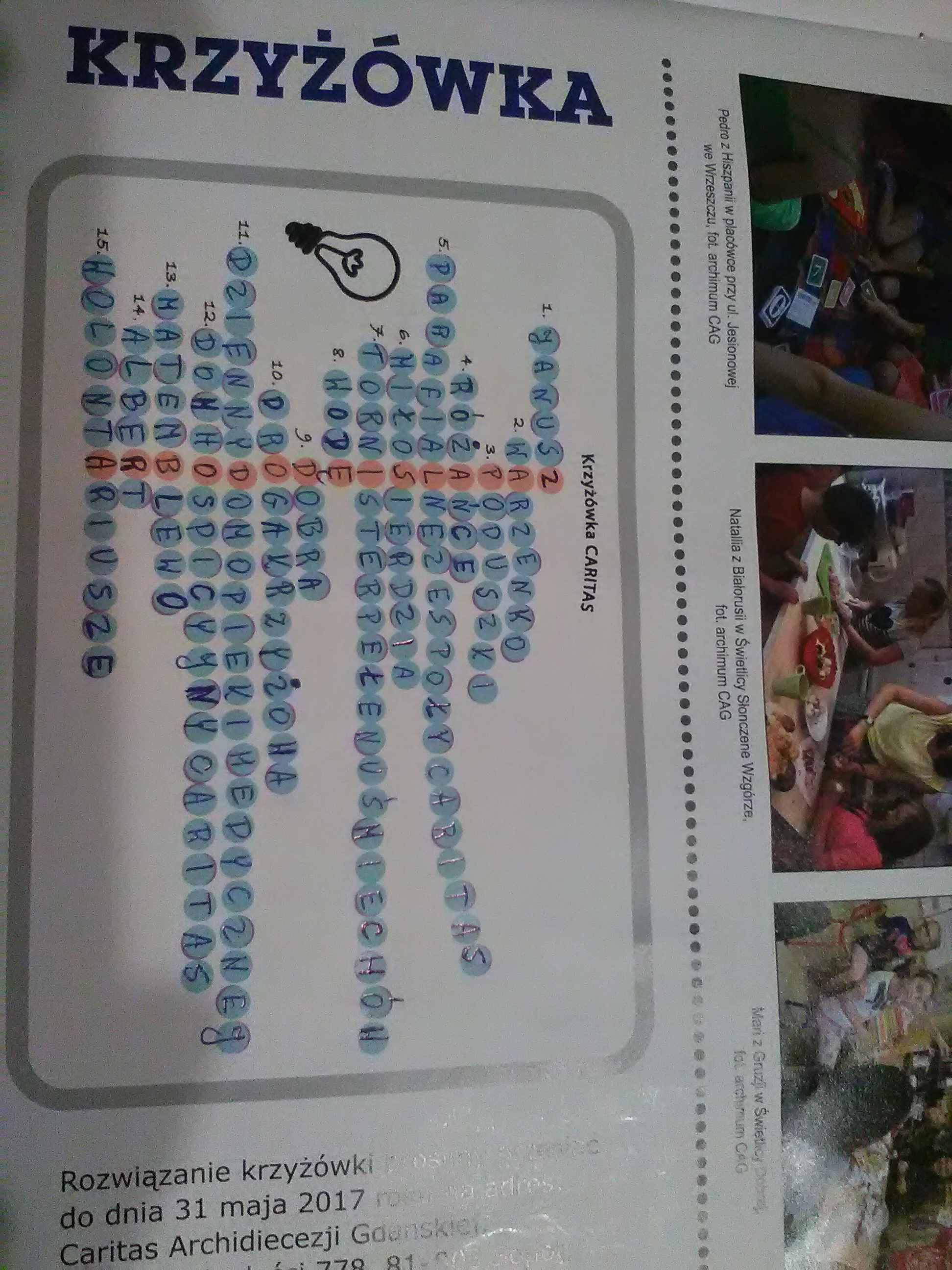 Z wielką radością informujemy, iż została rozlosowana nagroda w konkursie „krzyżówka caritas”. W bezpłatnej gazetce „Caritas Archidiecezji Gdańskiej – nasze dzieła w ubiegłym roku” pojawiła się krzyżówka, której rozwiązanie brzmi: „Zapal się do dobra”. Wśród wszystkich prawidłowych rozwiązań rozlosowano nagrodę główną – voucher do restauracji „PORT LAND” w Gdańsku. Zwyciężczyni na obiad przyjedzie aż z okolic Wejherowa. Serdecznie gratulujemy!
