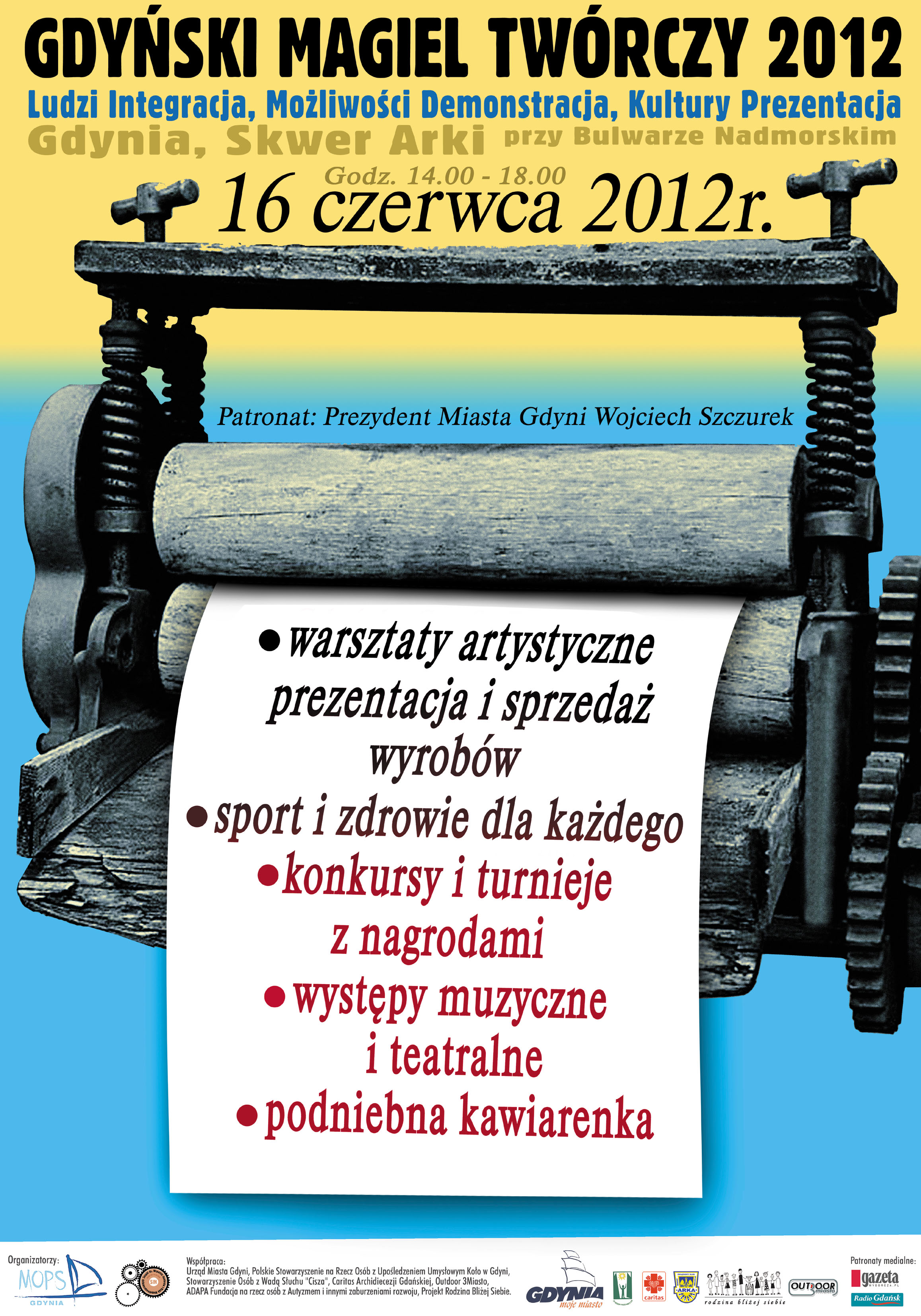 Uczestnicy i pracownicy Warsztatu Terapii Zajęciowej mają przyjemność zaprosić wszystkich chętnych na IV Gdyński Magiel Twórczy. Celem imprezy jest integracja osób z niepełnosprawnością intelektualną ze społecznością lokalną Gdyni poprzez prezentację szeroko rozumianej twórczości i umacnianie pozytywnych relacji społecznych. Uczestnicy Warsztatów Terapii Zajęciowej, ośrodków wsparcia i gdyńskich szkół będą mieli okazję do zaprezentowania swojej twórczości muzycznej, teatralnej, plastycznej.