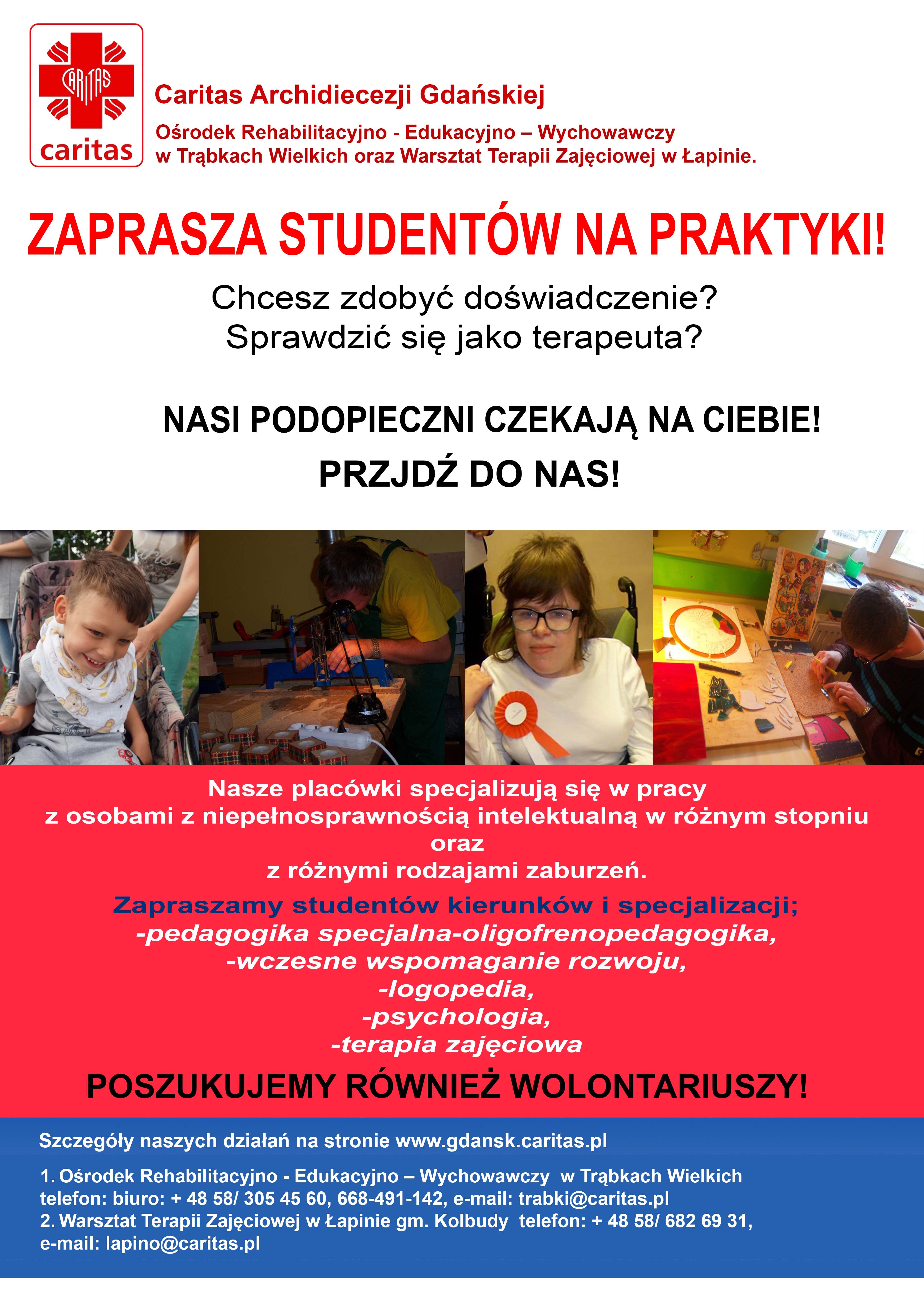 Serdecznie zapraszamy studentów, słuchaczy szkół policelanych oraz wszystkich uczniów, którzy chcą sprawdzić się w pracy z osobami z niepełnosprawnością intelektualną. OREW w Trąbkach Wielkich sprawuje specjalistyczną edukację oraz opiekę nad dziećmi i młodzieżą do 25.roku życia. Poszukujemy osób chętnych do pomocy naszym podopiecznym w codziennej terapii. WTZ w Łapinie specjalizuje się w aktywizacji społecznej i zawodowej osób dorosłych. Proponujemy elastyczne godziny praktyk. Zdobyte u nas doświadczenie przyłoży się na szerokie kompetencje w przyszłości- ZAPRASZAMY!