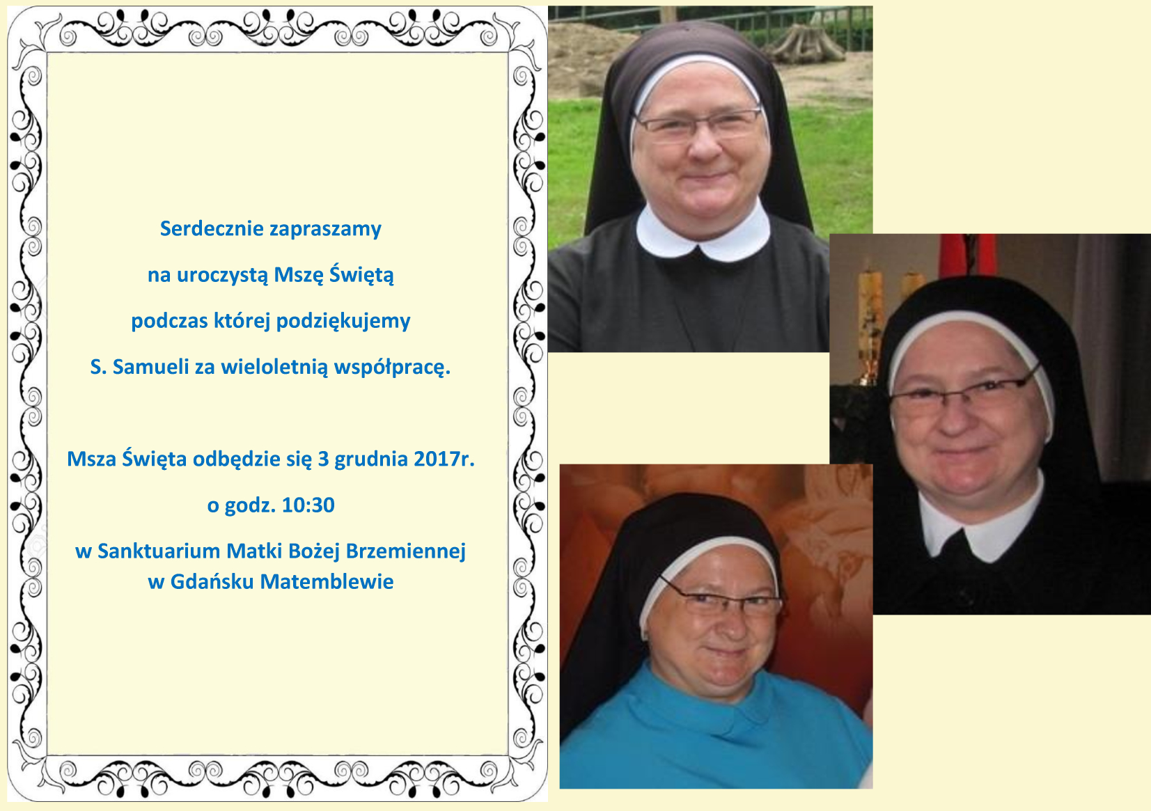 s. Samuelo dziękujemy za Twoją obecność, radość, którą szczodrze rozdawałaś zarówno swoich podopiecznym jak i współpracownikom. A Ducha Świętego prosimy, aby obficie obdarzył Cię tymi darami, które w nowym miejscu pracy będą najbardziej potrzebne.
