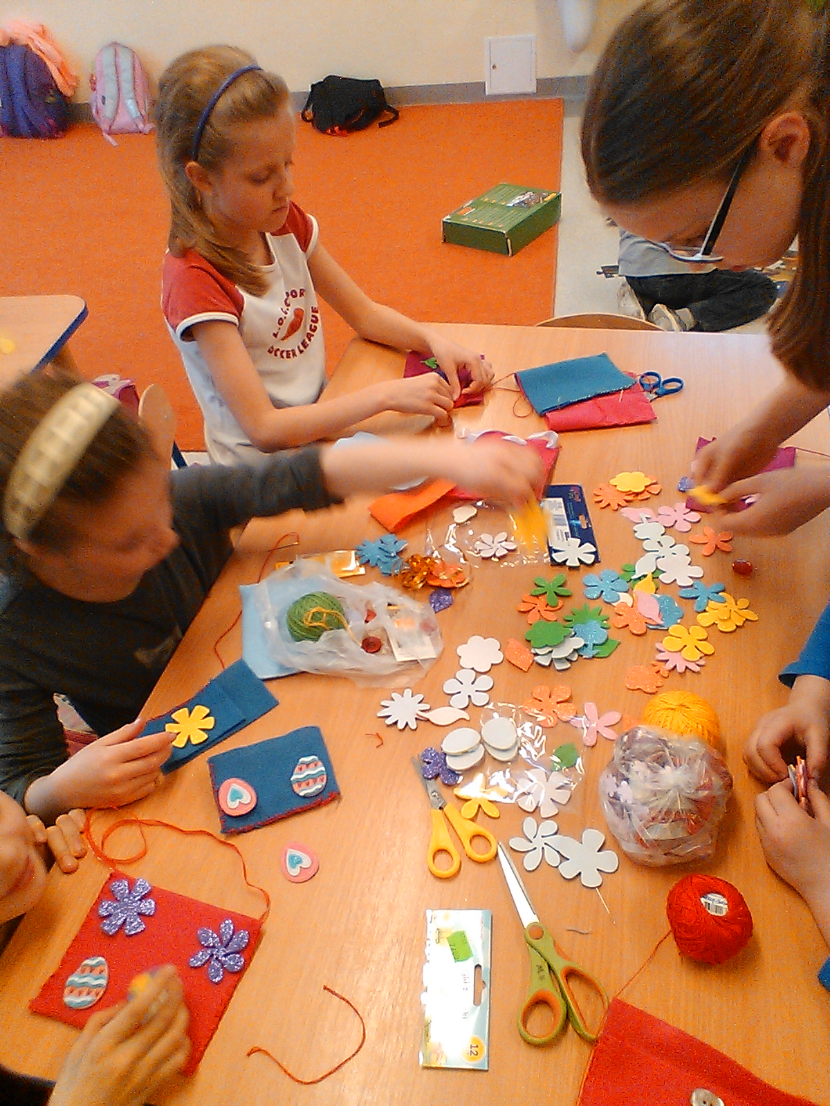 Jak tylko poczuliśmy w Glinczu pierwszy, ciepły powiew wiatru, postanowiliśmy przenieść się w świat wiosennych barw. Zrobiliśmy kolorowe torebki na różne drobiazgi. Przyozdobiliśmy je kwiatami oraz innymi barwnymi elementami dekoracyjnymi. Niektórzy z nas woleli układać puzzle i nieźle im to szło. Było dużo radości przy wspólnej pracy i mamy ciekawe plany na kolejne spotkania. Będziemy np. malować witraże.