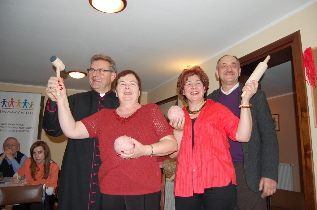 Już od godziny 16 słychać było dochodzące z podziemi domu parafialnego przy Parafii pw. Św. Piotra i Pawła w Orlu, śpiewy i tupanie. Właśnie tam w ramach realizacji inicjatywy w projekcie RAZEM MAMY WIĘCEJ, młodsi mieszkańcy Orla we współpracy z członkami Parafialnego Zespołu Caritas, przygotowali dla swych Babć oraz Dziadków bal na wzór starej kaszubskiej tradycji jaką są Zapusty. W ramach powitania swych gości najmłodsi mieszkańcy Orla zaprezentowali autorskie przedstawienie, które spotkało się z bardzo miłym przyjęciem. Wieczór ten wykorzystali również do tego, by nauczyć się czynności wykonywanych przez starych Kaszubów, mogliśmy zobaczyć ubijanie masła, darcie pierza czy nawijanie wełny w kłębki. I tak już teraz wiemy, że pojawienie się „grudek” w ubijanej i „rolowanej” śmietanie świadczy o rozpoczęciu procesu tworzenia się masła. A potem już zabawy nie było końca… 🙂