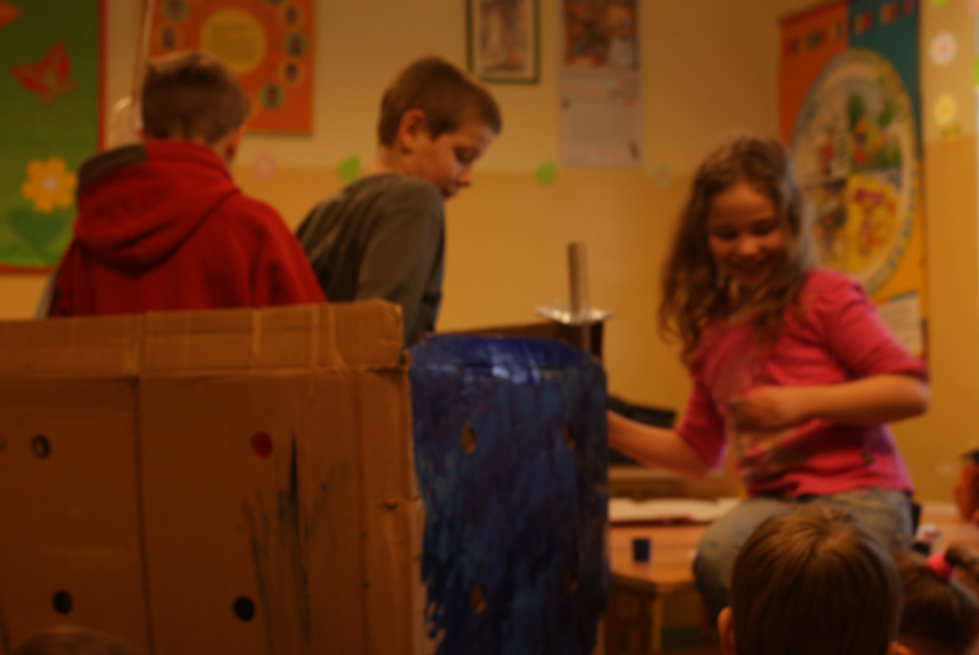 Oj działo się wczoraj w naszej świetlicy w Glinczu! Na początku zajęć Pani Agata zjawiła się w sali z ogromnymi kartonami, które od razu wzbudziły zainteresowanie wszystkich dzieci. Co to będzie? Może zamek? Może…? Statek!!! No tak! Prawdziwy okręt żeglarski! A jak żeglarski to musi mieć maszt i żagiel! Konstrukcja powstawała w bardzo szybkim tempie – każdy miał swój wkład w budowanie okrętu. A na koniec – kiedy już wszystko było gotowe – mali żeglarze nauczyli się śpiewać znaną szantę żeglarską pt. „Pacyfik”, którą wkrótce będą mieli okazję zaprezentować podczas konkursu szant w Warzenku.
