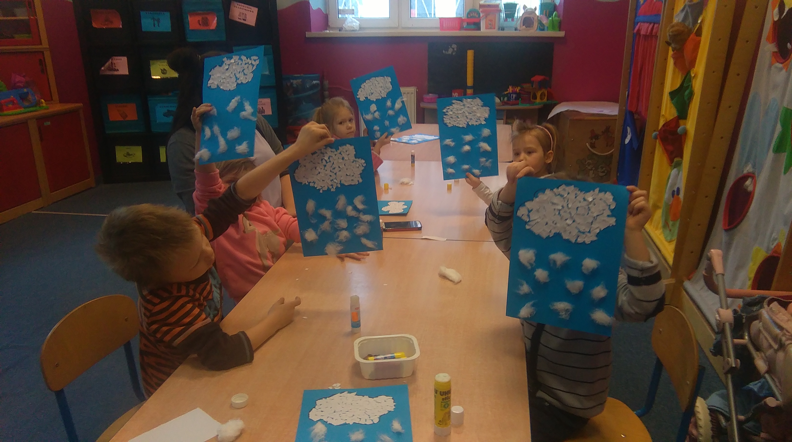„Pada, pada śnieg….”, nie tylko na dworze. Nasze Krasnale przy pomocy skrawków papieru oraz waty tworzyły zimowy pejzaż.