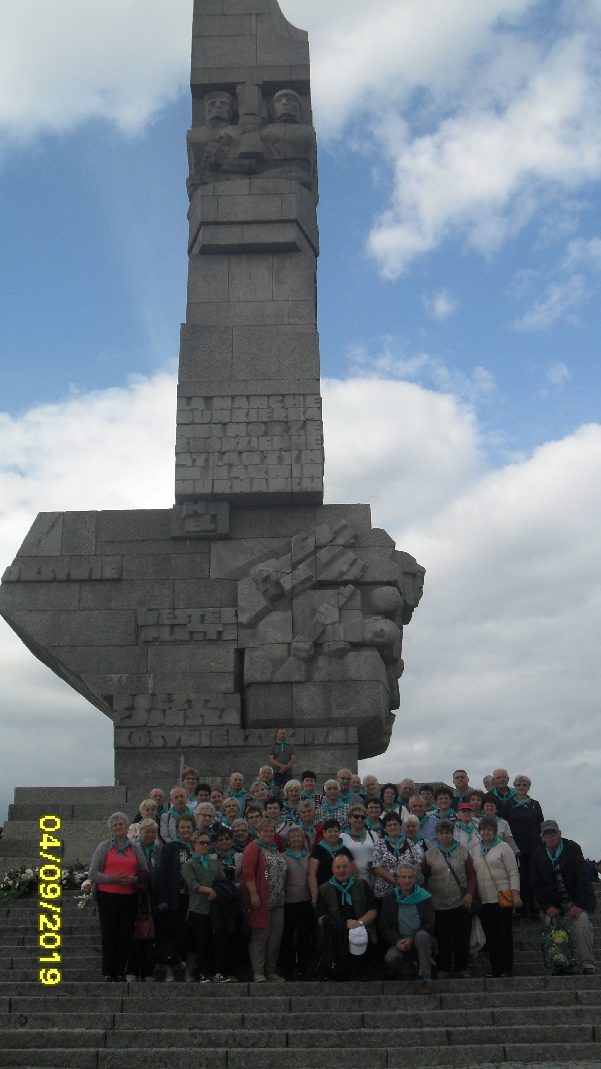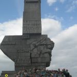 Po zejściu ze statku przewodnik zaprowadził nas drogą ok. 1 km pod Pomnik Obrońców Wybrzeża. W czasie drogi opowiadał, że w 1924 r. Liga Narodów przekazała Półwysep Westerplatte Polsce. Powstała polska składnica wojskowa. Załoga składała się z2 oficerów,20 podoficerów i 66 żołnierzy, znajdowały się tam koszary i 5 wartowni, do dzisiaj ostała się Wartownia Nr 1. W dniu 1 września 1939 r. o godz. 4.45 Westerplatte zostało ostrzelane przez pancernik” Schleswig-Holstein”, brała udział również piechota morska. Polacy pod dowództwem mjr Henryka Sucharskiego dzielnie się bronili przez 7 dni, chociaż wg planów Niemców, Westerplatte miało być zdobyte w 6 godz. W bohaterskiej obronie zginęło 15 żołnierzy a około 50 zostało rannych. Przewodnik udał się z nami do Wartowni Nr 1 i na cmentarz, gdzie w 1971 r. został pochowany mjr H. Sucharski. W dniu 1września 2019 r. zostały tam złożone wieńce przez premiera M. Morawieckiego i członków Rządu , które wszyscy podziwiali, my złożyliśmy skromny znicz. Przy drodze do pomnika postawiono kilka nowych tablic informacyjnych. Pomnik Obrońców Wybrzeża ma 25 m wysokości, składa się z 236 bloków granitowych ozdobionych płaskorzeźbami, na których wykonano napisy upamiętniające Obrońców Polskiego Wybrzeża, nazwy miejsc bitew morskich. 7 zniczy symbolizuje 7 dni obrony. Pomnik został odsłonięty w 1966 r. Pod pomnikiem w 1987 r był obecny nasz papież Jan Paweł II. Przechodziliśmy obok budynku Elektrowni – jedynym ocalałym w walkach, gdzie w 80 rocznicę wybuchu II Wojny Światowej został wmurowany kamień węgielny – pod Muzeum Westerplatte i Wojny 1939.